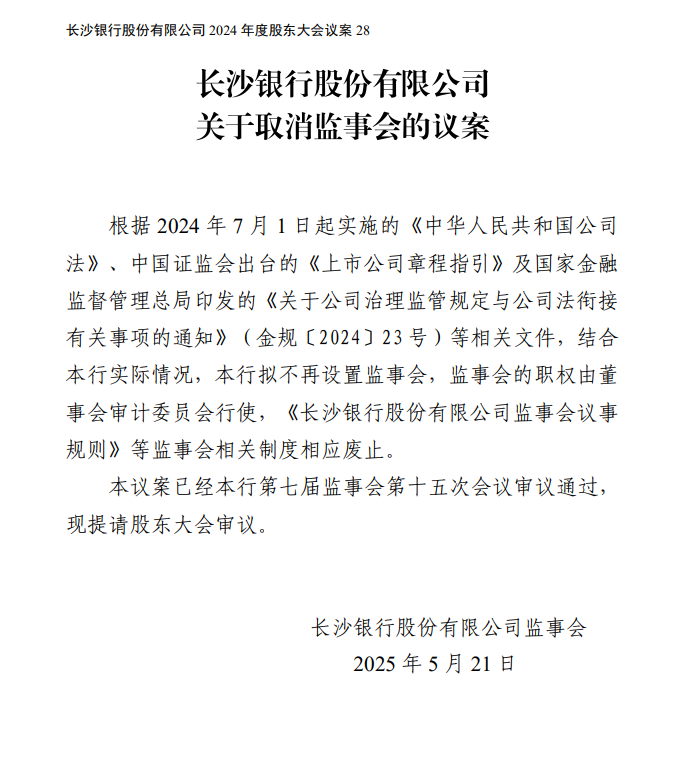 5月21日,长沙银行召开了2024年度股东大会,审议并通过了“关于取消监事会”的议案。