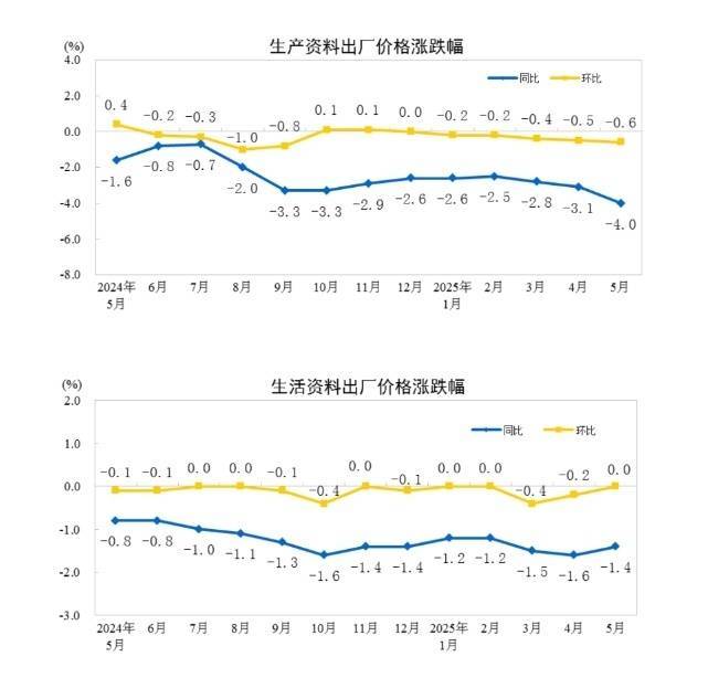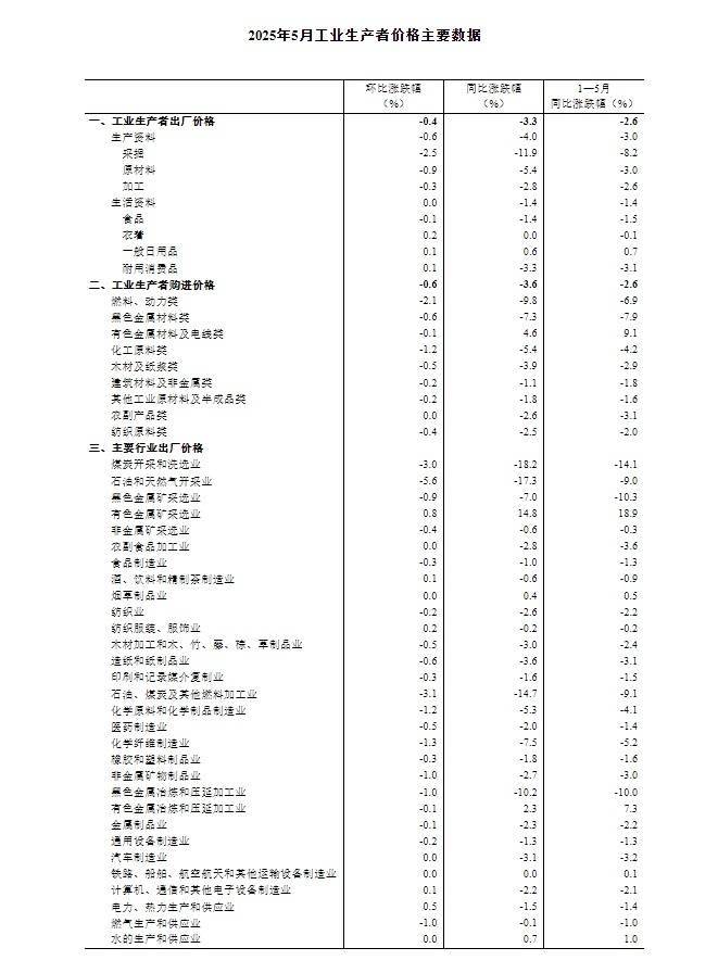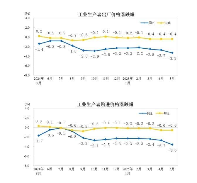 2025年5月份,全国工业生产者出厂价格同比下降3.3%,环比下降0.4%;工业生产者购进价格同比下降3.6%股票配资炒股公司,环比下降0.6%。1—5月平均,工业生产者出厂价格和购进价格比上年同期均下降2.6%。